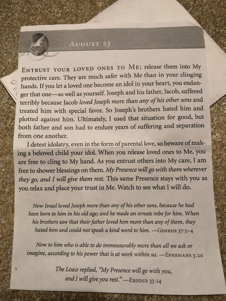 Last Saturday (Aug 22) I wrote and published a poem above “The Monarchs Flight”. A few days ago, someone anonymously placed a copy of the August 23 Jesus Calling devotional in our mailbox. Today our daughter left for Mexico flying with a one-way ticket. She cannot get a student visa at this time so she will have to return at some point. Even so, she may never return “home”. We have known for many years she would leave with a one-way ticket but we never imagined it would be preceded by a period of estrangement. [Gasp] I typed the words and may post this and reveal the dark secret behind last months ambiguous request for prayers for our family.